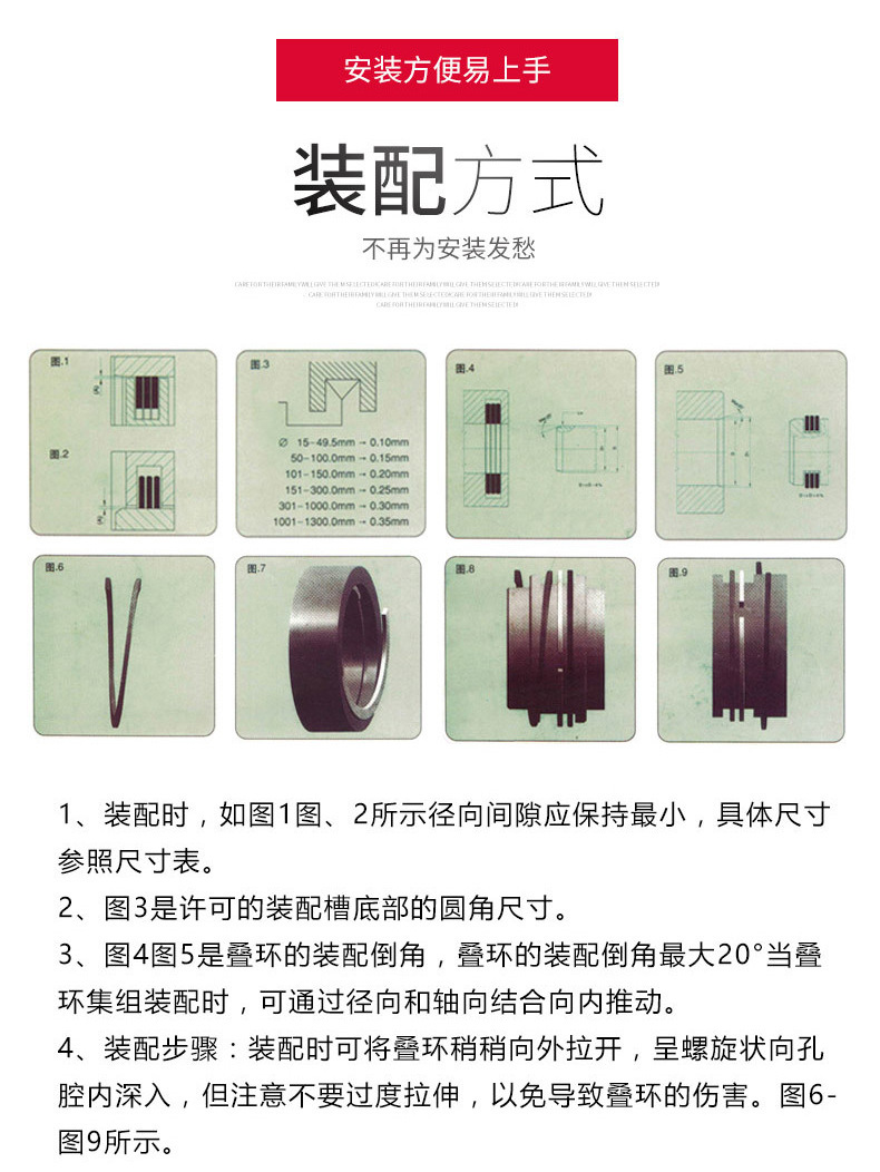 与缠绕一圈的FDA单片环相反,FDC片状环缠绕两圈。该环以具有较强加紧力而出众。适合于较高转速并无缓冲开口。如果对密封性能要求较高则应选用该环。它以非常适用于有灰尘和污染的环境。 双环也可以作径向轴密封环的保护密封装置。根据简单地安装FDA-K或FDA-KZ的布置于FDA-Z或FDA-ZZ布置相比要尽可能地将环向槽内拉。 在热膨胀时要求必须保证槽宽公差。 转速大于1000rpm时将槽宽拓宽10%。